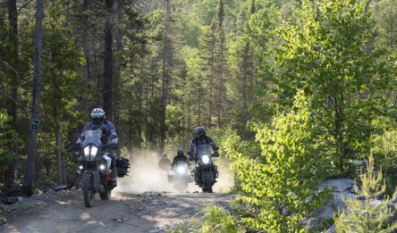Vous prenez la direction de la Côte-Nord par un itinéraire spectaculaire. Vous empruntez la route 138 au pied des falaises du parc national du Fjord-du-Saguenay avant de rejoindre un réseau de pistes forestières bordées de conifères. Vous alternez sections roulantes et passages plus techniques jusqu’au lac Brébeuf, dans une atmosphère de nature brute et silencieuse.